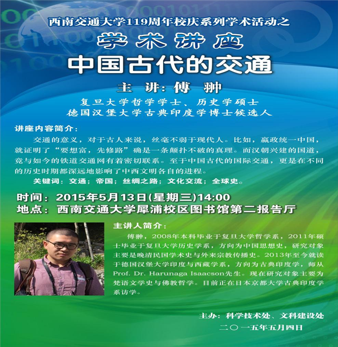 由英国威廉希尔公司主办,科技处、文科建设处联合承办的“119周年校庆系列学术活动之学术讲座中国古代的交通”将于2015年5月13日在我校犀浦校区举办。