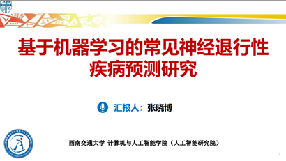 张晓博老师以“基于机器学习的常见神经退行性疾病预测研究”为主题,从研究背景、主要研究工作、下一步研究计划进行了详细介绍,重点介绍了“基于一致性多视图聚类的老年痴呆症进展预测”及“基于多视图深度图表达学习的帕金森病和老年痴呆症预测”两个最新研究模型,并与科研院人员就相关情况进行了深入交流。